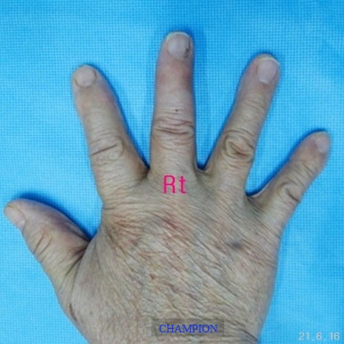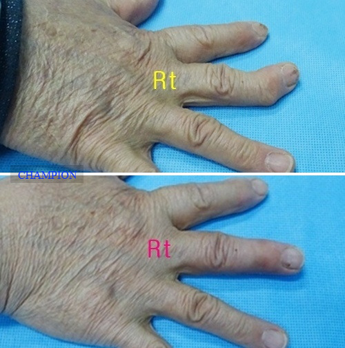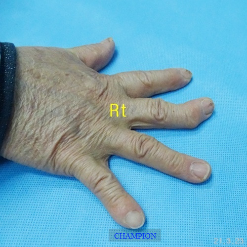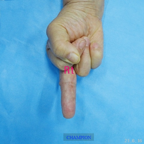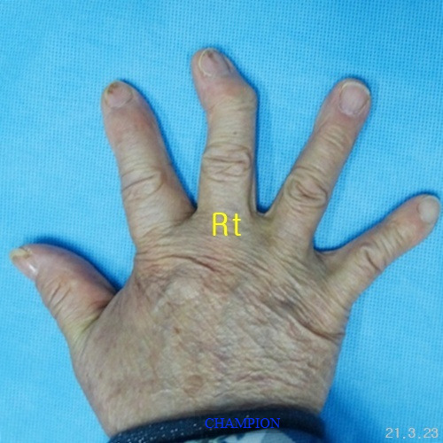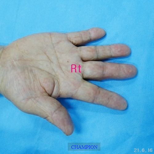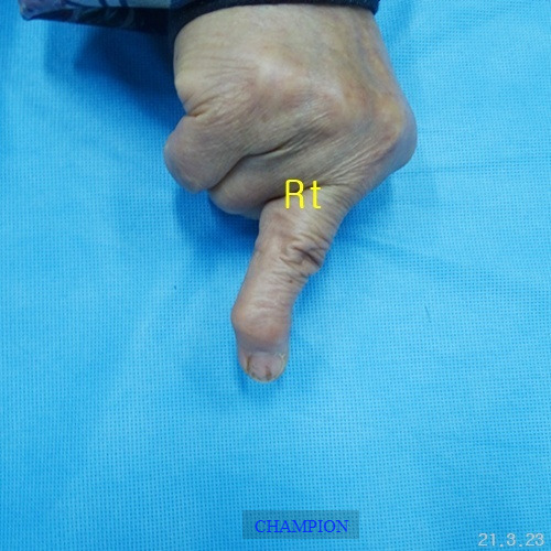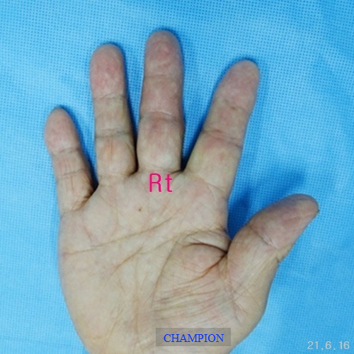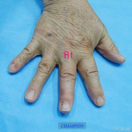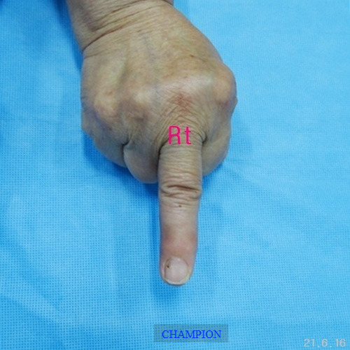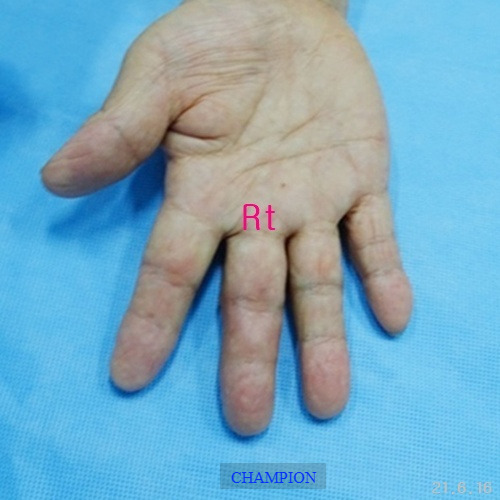 평생 손가락휨 때문에 손 모양이 콤플렉스였던 환자는 가정일을 포함한 일상생활에서 불편함이 많았고, 나이가 들면서 관절염이 생기고 손가락이 더욱 휘어지는 손가락휨, 굴지증 변형때문에 한번에 치료할 수 있는 외과적 처치 방법을 선택하여 부분마취로 진행된 굴지증 수술은 단 20분 만에 끝났고, 다음 날부터 가벼운 일상생활에 복귀할 수 있었습니다. 무엇보다 손 모양이 자연스러워져 “이제는 자신 있게 악수를 할 수 있다"라며 만족감을 표현했습니다.